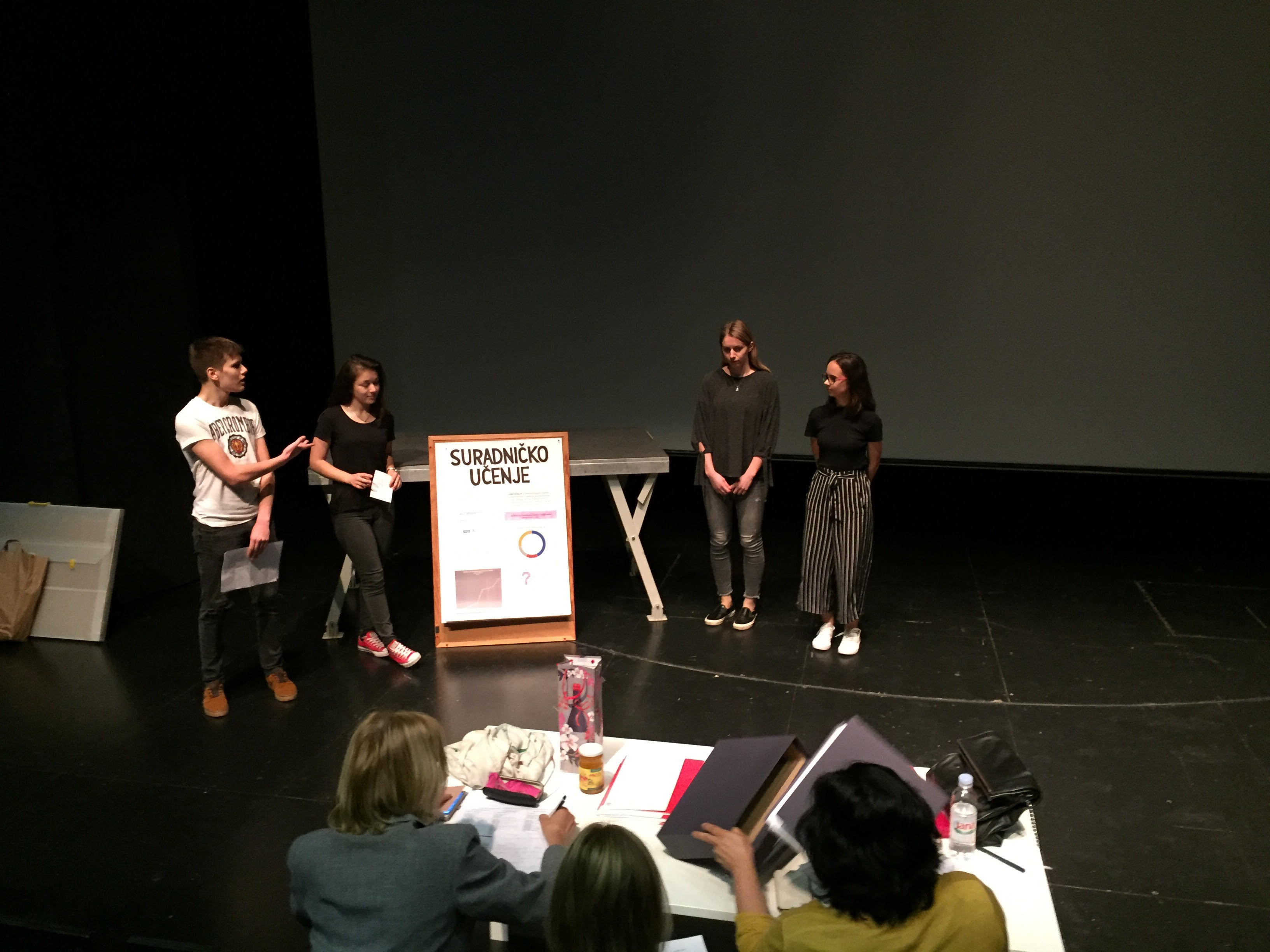 U Muzeju suvremene umjetnosti u Zagrebu je 21. svibnja održana Državna smotra projekata iz područja Građanskog odgoja i obrazovanja. Našu su školu s projektom Suradničko učenje predstavili Ida Ibrišimović (3.a), Karla Kereković (3.f), Sven Mikulić (3.a) i Ana Tečić (3.e). Komentari stručnog povjerenstva su bili izvrsni - naši su učenici pohvaljeni za odabir i obradu teme, te samouvjerenost pri nastupu! Čestitamo!