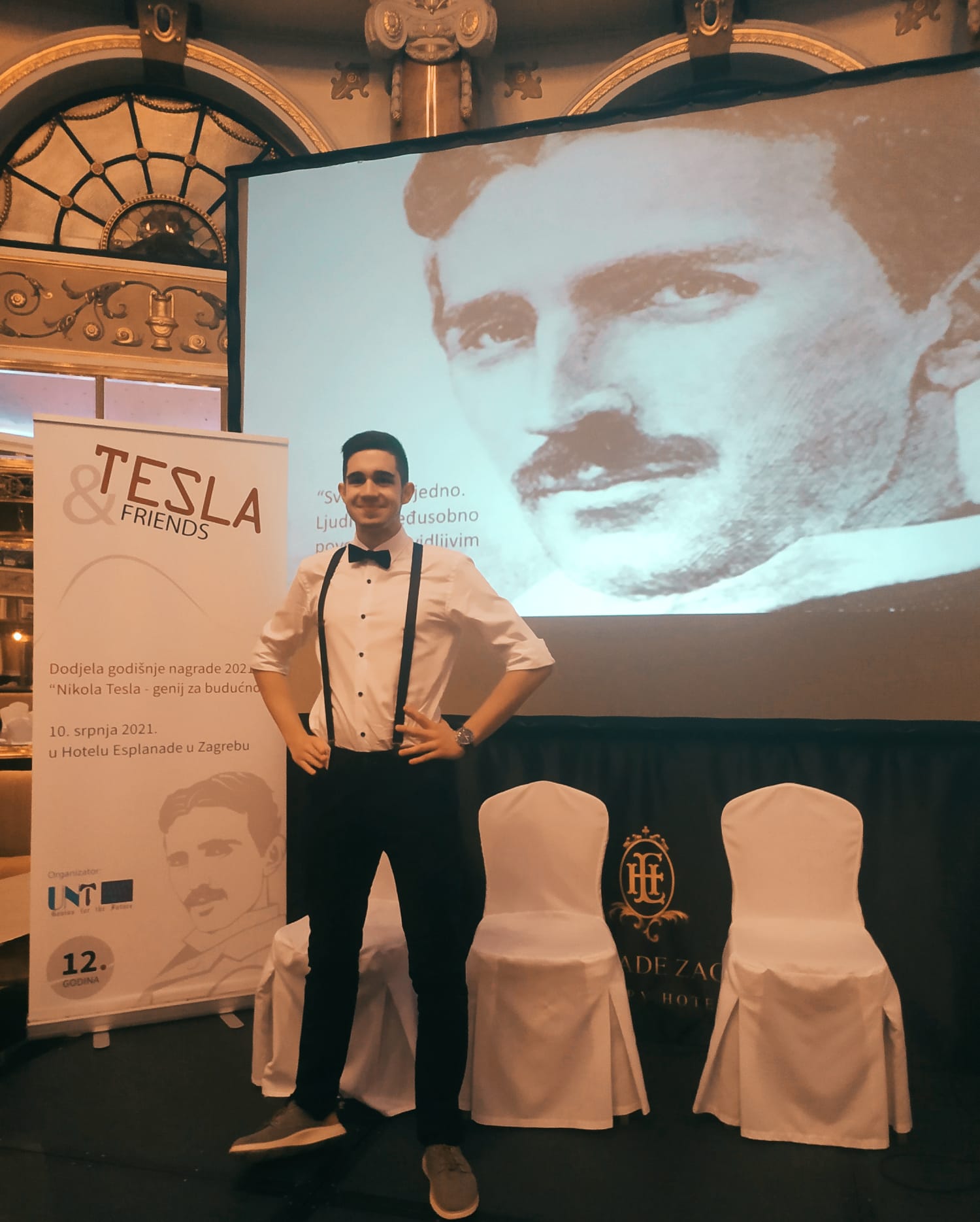 Dana 10. srpnja 2021. u zagrebačkom hotelu Esplanade u organizaciji udruge „Nikola Tesla – genij za budućnost“ obilježen je 165. rođendan nacionalnog velikana Nikole Tesle. Proslavi su prisustvovali naš maturant Marko Višić i njegova mentorica, prof. Valentina Novak. Marko je nakon dva kruga natjecanja nominiran za godišnju nagradu „Nikola Tesla – genij za budućnost“ u kategoriji „Kviz znanja iz fizike i općeg znanja o Nikoli Tesli“. Iako mu nije pripala glavna nagrada, večer u Esplanadi Marku će ostati u lijepom sjećanju. Duhovito je primijetio da se „koračajući tapeciranim hodnicima Esplanade prema luksuznom toaletu osjećao kao gospodin Glembay“. Marku želimo puno sreće na Odsjeku za fiziku zagrebačkog PMF-a gdje će od jeseni dodatno istraživati rad Nikole Tesle za kojeg kaže da je „izniman pojedinac čiji rad prezentira snagu uma i upornost“.