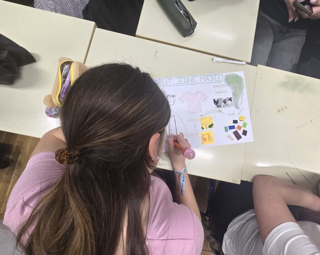 Profesorica Mila Bartulović Bednjanec u Tjednu zdravlja je s više razreda provela radionicu Put jedne majice. Na radionici učenici su u grupama radili na istom zadatku: trebali su napraviti kolaž o svim koracima na putu proizvodnje, prodaje i uporabe jedne obične jednostavne pamučne majice te razmisliti o njihovom utjecaju na klimu i klimatske promjene. Razmatrali su sve aspekte tog puta: ljude, geografske prostore, potrebne resurse i okoliš.